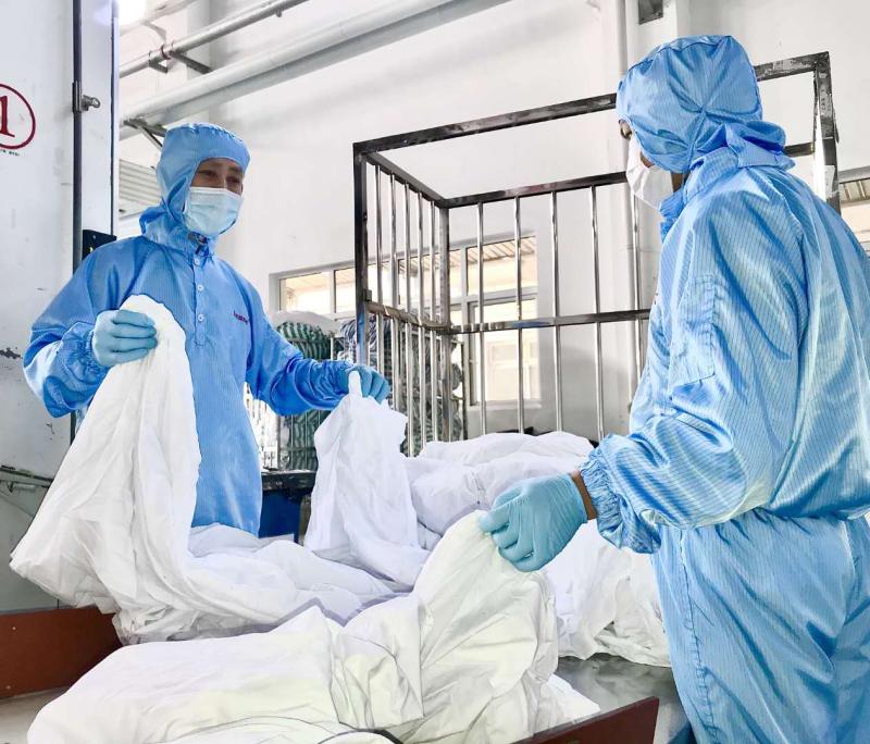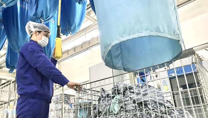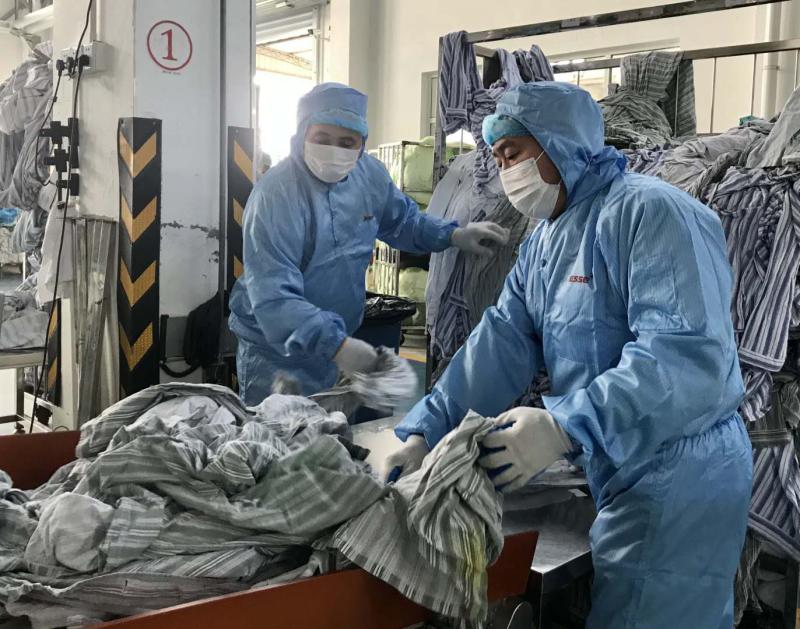在公司新建的3500平方米廠房?jī)?nèi),5條“洗滌龍”(隧道式洗衣機(jī))和12臺(tái)隔離式洗衣機(jī)協(xié)同作業(yè),并集中辟出專門隔離區(qū)域進(jìn)行感染性織物處置,有效防止醫(yī)療感染性織物因洗滌和運(yùn)輸產(chǎn)生的二次污染和交叉感染風(fēng)險(xiǎn)。