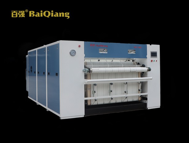 1、本機前端兩個烘筒采用高低結構排列,布草S型走向通過兩個烘筒,使布草的雙面都可以得到有效熨燙。而且每個烘筒上熨平帶的有效包角均高達300度左右,相較于槽燙和普通平燙,熨燙效率大幅提高。